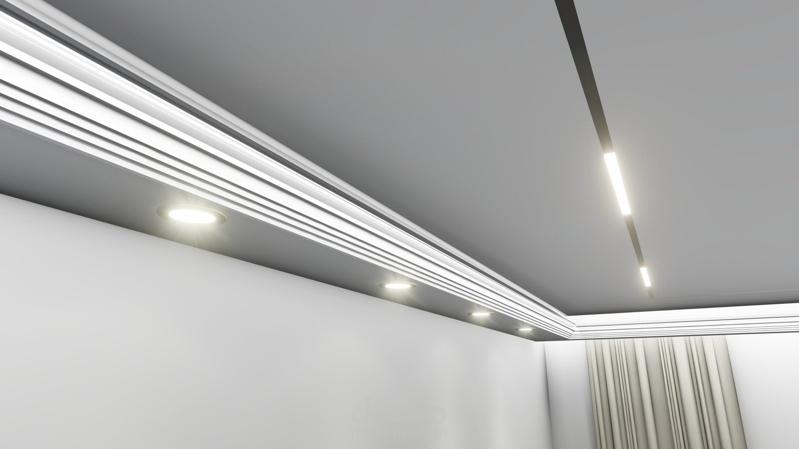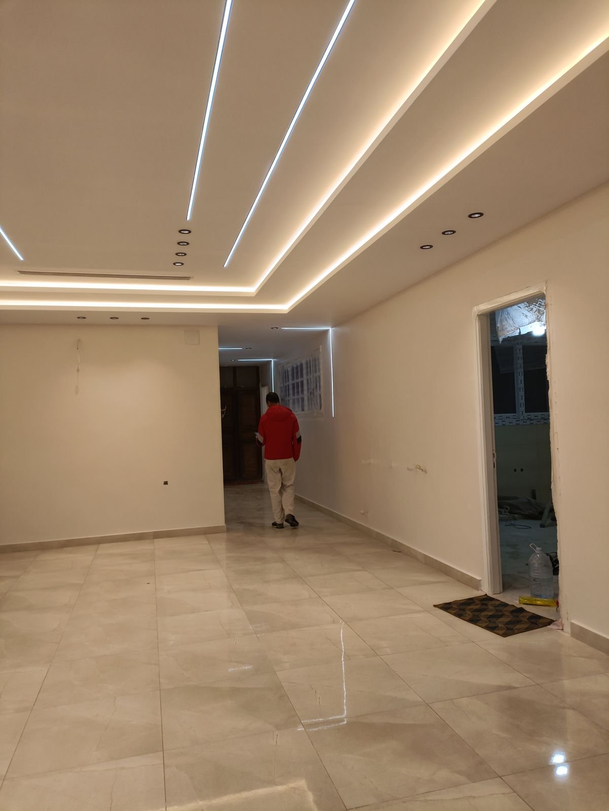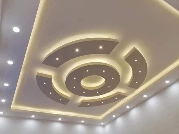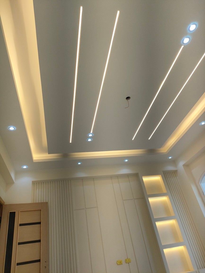 تصميم وتنفيذ جبس بورد للأسقف والجدران، مع إنارة مخفية، ديكورات تلفزيون، وأشكال هندسية عصرية.